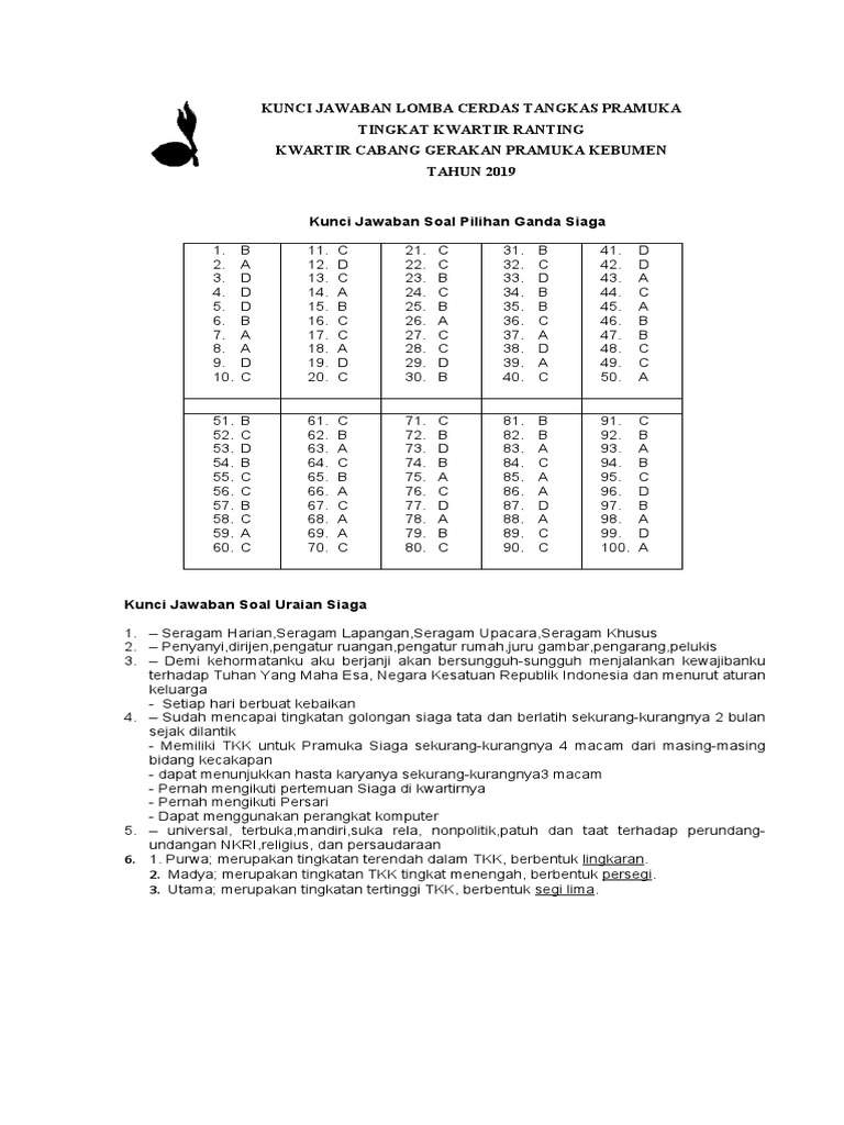 Pilihan Ganda Pramuka from imgv2-1-f.scribdassets.com Soal pramuka penggalang dan siaga beserta jawabannya Bupati/walikota dalam pramuka jabatannya sebagai gubernur dalam pramuka jabatannya sebagai. Soal pramuka penggalang pilihan ganda. Sep 12, 2017 · contoh latihan soal kepramukaan dan kunci jawabannya bagian 2 amongguru.com. Soal pilihan ganda pengetahuan pramuka 1. Soal pilihan ganda tentang bola basket dan kunci jawaban. Robert stephen william smyth 2. Soal ppgd 2018 guru ilmu sosial.